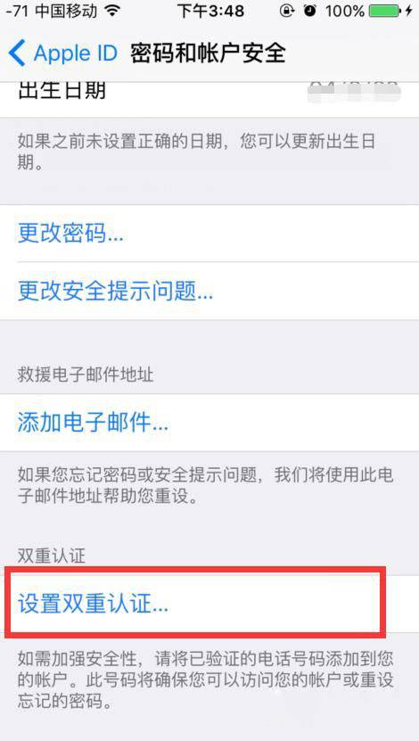 ID 2、点击【密码与安全性】选项。 3、点击完成后在页面最下方点击【设置双重认证】选项 4、点击【继续】按钮,如果出现提示框,选择【仍要打开】按钮。 5、在输入电话号码页面确认双重验证的保密电话,点击【下一步】收到验证码后完成验证即可。